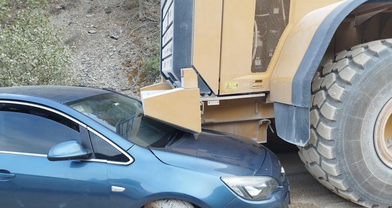 Kum ocağı mevkisinde geri manevra yapan O.A. yönetimindeki kepçe, arkasında bulunan S.A.’nın (69) kullandığı otomobile çarptı. İş makinesi operatörü, çarptığı aracı fark etmeyerek bir süre sürükledi.