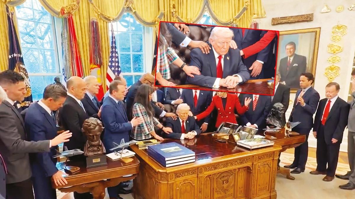 ABD Başkanı Donald Trump, Beyaz Saray’ın simgesi olan Oval Ofis’te son derece sıra dışı bir buluşmaya ev sahipliği yaptı. Ülkenin dört bir yanından gelen dini liderler, siyasetçiler ve üst düzey danışmanlardan oluşan kalabalık bir heyet, başkanın çalışma masasının etrafında toplanarak Trump için topluca dua etti. Törende, Evanjelik geleneğe özgü ritüeller dikkat çekti. Dua sırasında katılımcılar ellerini başkanın omuzlarına ve sırtına koydu. Oval Ofis’te yapılan törende, dini liderler Trump için ‘ilahi rehberlik’ talep etti Dua sırasında Trump’ın etrafında toplanan katılımcılar, ellerini başkanın üzerine koyarak şu sözlerle yakarışta bulundu: “Rabbim, bugün senin huzuruna çıkmaktan ve Başkanımızın kollarını yukarı kaldırmaktan onur duyuyoruz. Senin bereketinin ve lütfunun onun üzerinde kalmaya devam etmesi için dua ediyoruz. Göklerden gelen bilgeliğin onun kalbine ve zihnine dolması için dua ediyoruz; Rabbim, bugün karşı karşıya olduğumuz bu zorlu zamanlarda ona yol göster.” Törenin hangi nedenle düzenlendiğine dair resmi bir açıklama yapılmadı.