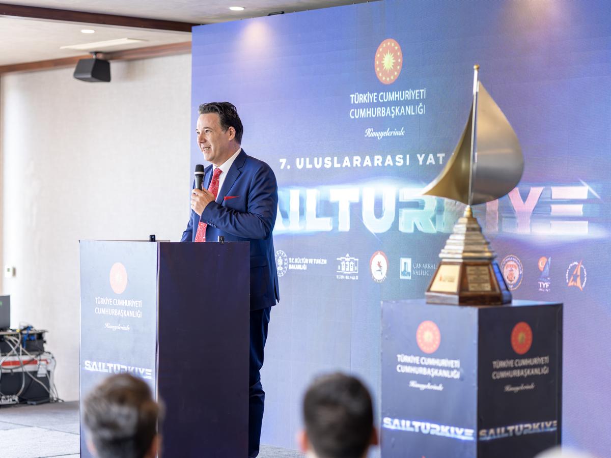 Bu organizasyon ile ülkemizin eşsiz coğrafyasını ve denizlerini dünya sahnesine taşımak, uluslararası sporcuları ve takımları Türkiye’de buluşturmak, yelken sporunu daha genç kitlelere yaymaktır. Gençlerimize ilham vermek, onları denizle buluşturmak, Türkiye’yi yelken sporunda küresel bir merkez haline getirmek en önemli hedeflerimiz arasındadır. Tam bu noktada çok büyük bir teşekkür ve şükran duygularımızı Türkiye Yelken Federasyonu Başkanı Sayın Özlem Akdurak’a sunmak isteriz. Gerçekten günü, gecesi, saati ayırmadan uluslararası her mecrada bize destek oluyorlar. Söylediğim gibi bu yıl ülkemizin tanıtımı adına aynı zamanda uluslararası ilişkiler anlamında da şanlı bayrağımızı vatanımızın tüm denizlerinde dalgalandırmak adına beş farklı etap planlıyoruz. İstanbul, Çanakkale, Samsun, Kuzey Kıbrıs Türk Cumhuriyeti’nde yelken açacağız. Bu kayıtlar henüz bitmediği için, hala açık olduğu için sizlere tahmini rakamları veriyorum. Toplamda 200 ekip, 2000’in üzerinde sporcu, 14 farklı ülkeden katılım bekliyoruz. Pandeminin ilk yılında, şampiyonanın ilk başladığı yıl 23 olan ekip sayısında burada muazzam bir artış görüyoruz.” ifadelerini kullandı.